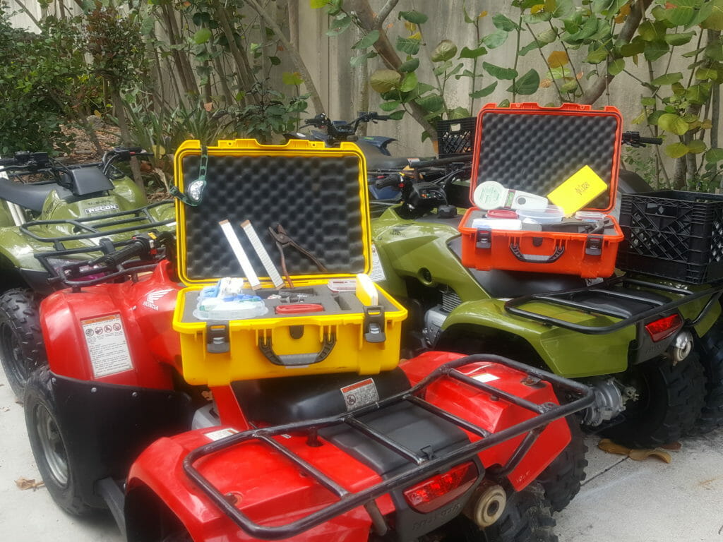 We're so excited for the 2017 research season! There have been a handful of nests reported in and around our nightly survey area in the last three days. We are getting all of our gear prepared to start regular surveys this weekend. It takes a full army of ATVs and lots of Pelican cases full of equipment to do the work that we do. We will patrol approximately 25 miles of beach each night depending on the conditions. When we encounter a nesting leatherback, the first thing that we do is check for tags. We use metal flipper tags and a PIT tag (the same kind of microchip in dogs and cats) for identification. If she is tagged, which approximately 50% of the turtles that we encounter each year are, we will record her tags, measure her, and check her for any new injuries. If she is not tagged, we apply new tags and take a skin biopsy as well. The data we collect have answered countless questions about leatherback reproductive biology and population status. We have many years of history with some of these turtles and it's always nice to see them return to nest. Leatherbacks typically nest every 2-3 years but occasionally many years will go by between visits. We are placing our bets on who we will see this year!