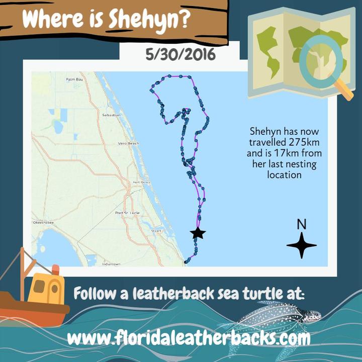 Shehyn is almost off our beach! She is 17 km away from her last nest. Tonight could be the night that she returns to nest again. It is now day 8 since we put her transmitter on. While that's a little on the short end for an internesting interval, she has done it before. We'll be out with all of our receivers in hand tonight! We know that she is off our study area based on her GPS location so we'll use a VHF receiver to pick up the pings from her tag when she surfaces. The receiver allows us to determine her location and typically leatherbacks are always swimming south as they head to the nesting beach so we'll follow her south from the beach until she comes in to nest. Tonight? Tomorrow? We'll see what she decides. active-map_720