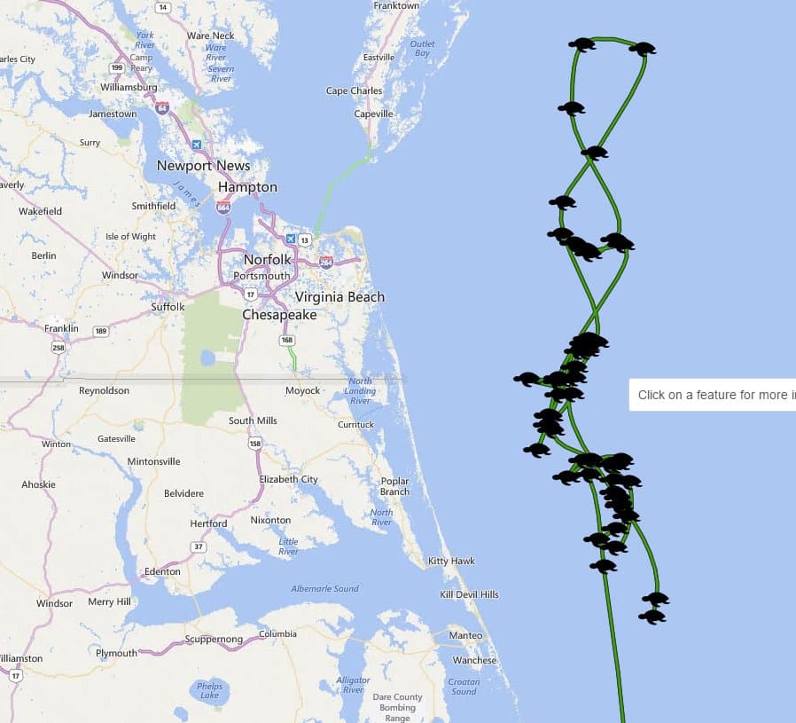 It has now been 50 days since we attached a small tracking device to a leatherback named Katia on Jupiter Island, Florida. Since leaving the beach on 6/10/2015, Katia has traveled more than 1,900 kilometers and is now located off the outer banks of North Carolina about 1,000 kilometers from the Jupiter Inlet in Florida. To view the current updated location of Katia, click here