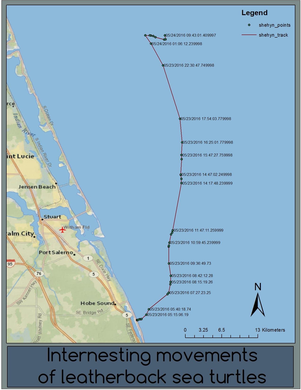 Two days ago, FLI researchers attached a transmitter to a nesting leatherback to monitor her movements during the internesting period. Leatherbacks nest up to 9 times in a season and typically nest every 9-11 days. Not much is known about their behavior in this short window so our team is tracking them during this time to get a better idea of what they're doing. We are now in our 3rd year of looking at this behavior. We have to be very selective about the turtle we choose for a transmitter. These turtles get two types of tags - one that collects location and another that collects dive movement and behavior. While some of the locations are transmitted back to us via satellite, most of the information is stored on the tag. That means we have to get it back! So we have to choose a turtle that we're fairly certain will come back again this season and hopefully in a somewhat accessible area so that we can remove the tags and download all of the valuable data. We got lucky and came across Shehyn on Sunday night. Shehyn was tagged by our team in June of 2014 so we know she has a history of nesting late into the season. We've also seen her 5 times on Jupiter Island this year so she should be pretty easy to find again. Follow along as we give you daily updates about Shehyn's location. Just two hours ago she was 25 miles off the coast of Sebastian. Why is this area so important? Keep reading below... tracking   Over the years, we've learned that after nesting, leatherbacks head straight to the Florida Current and head north. They take 2-3 days to swim north and eventually reach the Cape Canaveral area. There they do something very important that we call "The Turn." If leatherbacks don't turn there, it could mean that they're done for the season and they'll keep heading north. But if they make "the turn," then we know they're heading back this way for at least one more nest. So keep your eyes peeled on our WEBSITE and keep your fingers crossed that Shehyn makes "the turn!" If not, in about 25 days, her transmitter will fall to the bottom of the Ocean (as a safety measure) with all of its valuable data with it.